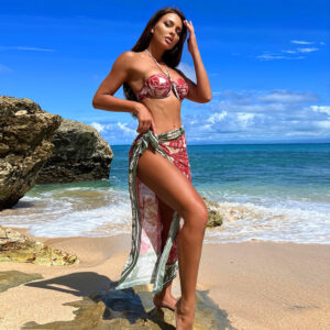 ชุดว่ายน้ำบิกินี่สายฝอ มีผ้าคลุมสะโพกยาว พิมพ์ลายเซ็กซี่