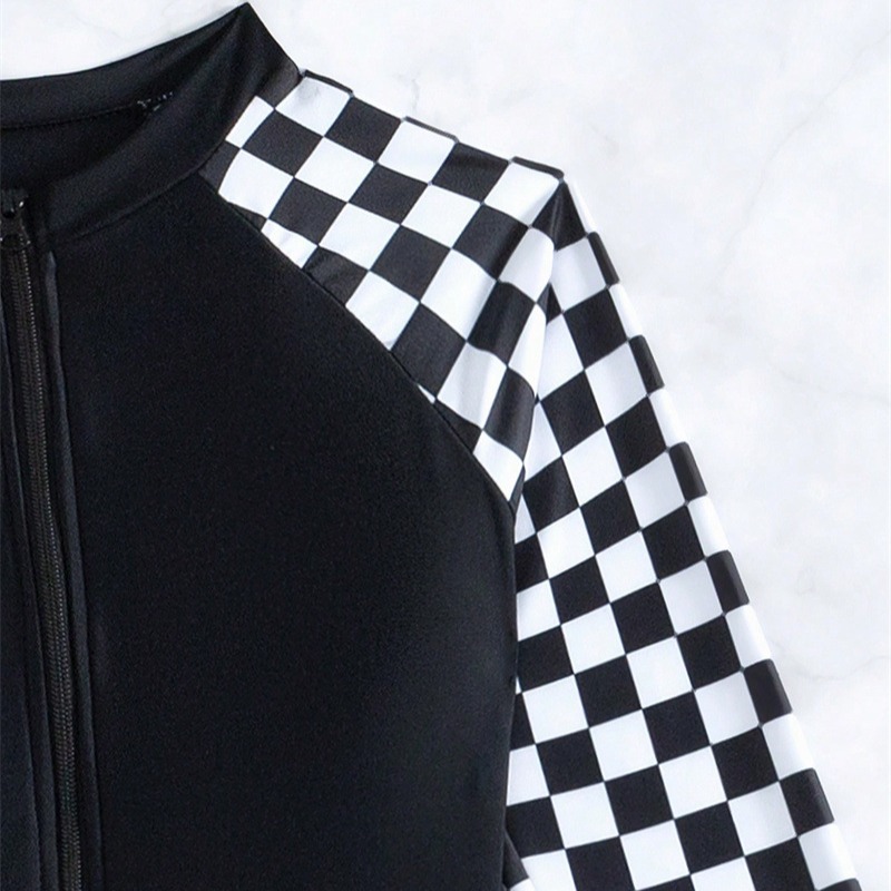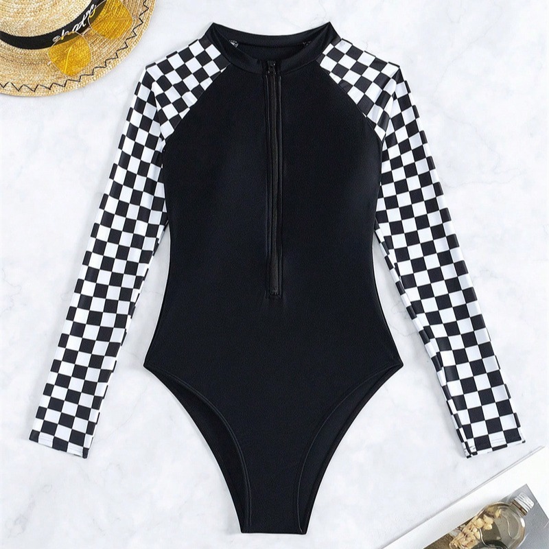 ชุดว่ายน้ำวันพีช กันแดดแขนยาว แต่งลายตารางขาวดำที่แขน เว้าไม่สูงมาก ไม่โป๊
