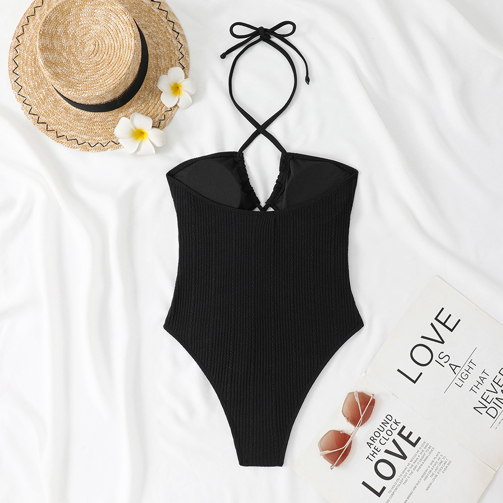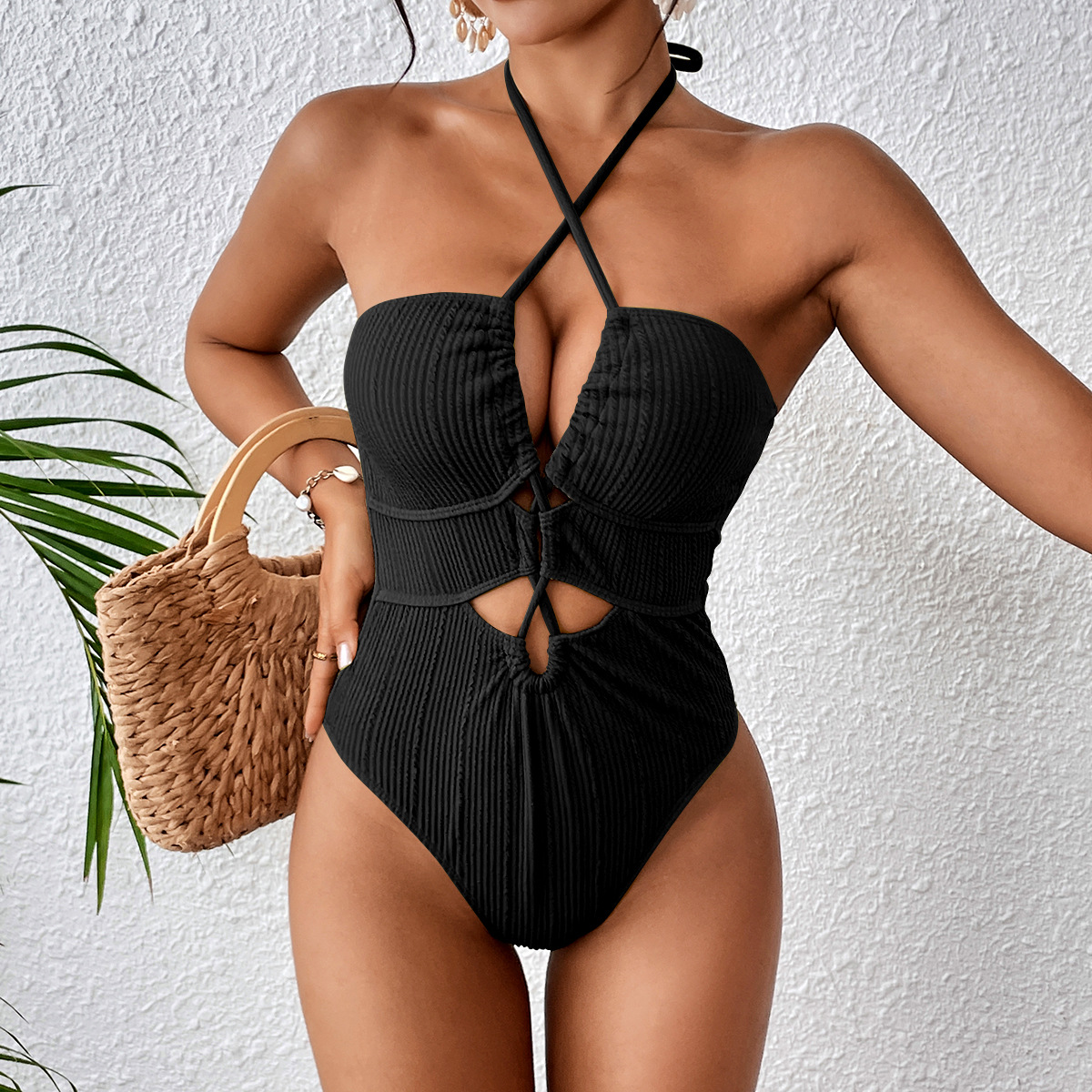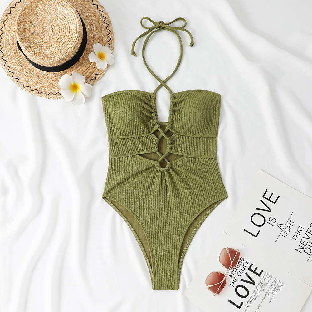 ชุดว่ายน้ำบิกินี่วันพีชแบบสายเดี่ยว แต่งเชือกผูกด้านหน้า เก็บทรงเก็บกระชับหุ่นสวยเซ็กซี่ ผ้ามีดีเทลลายในตัว