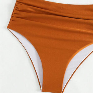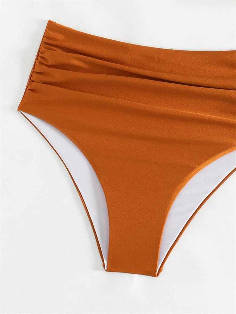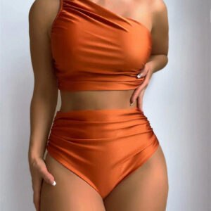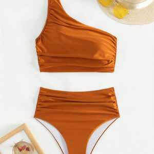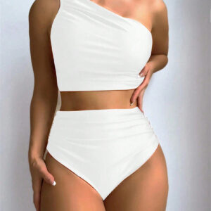 ชุดว่ายน้ำแยกชิ้นสีพื้น จับจีบ ไหล่เฉียง สวยเซ็กซี่