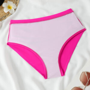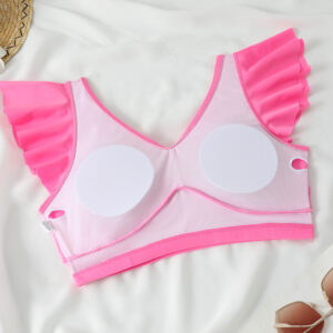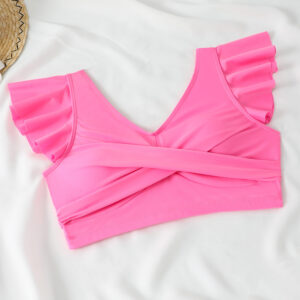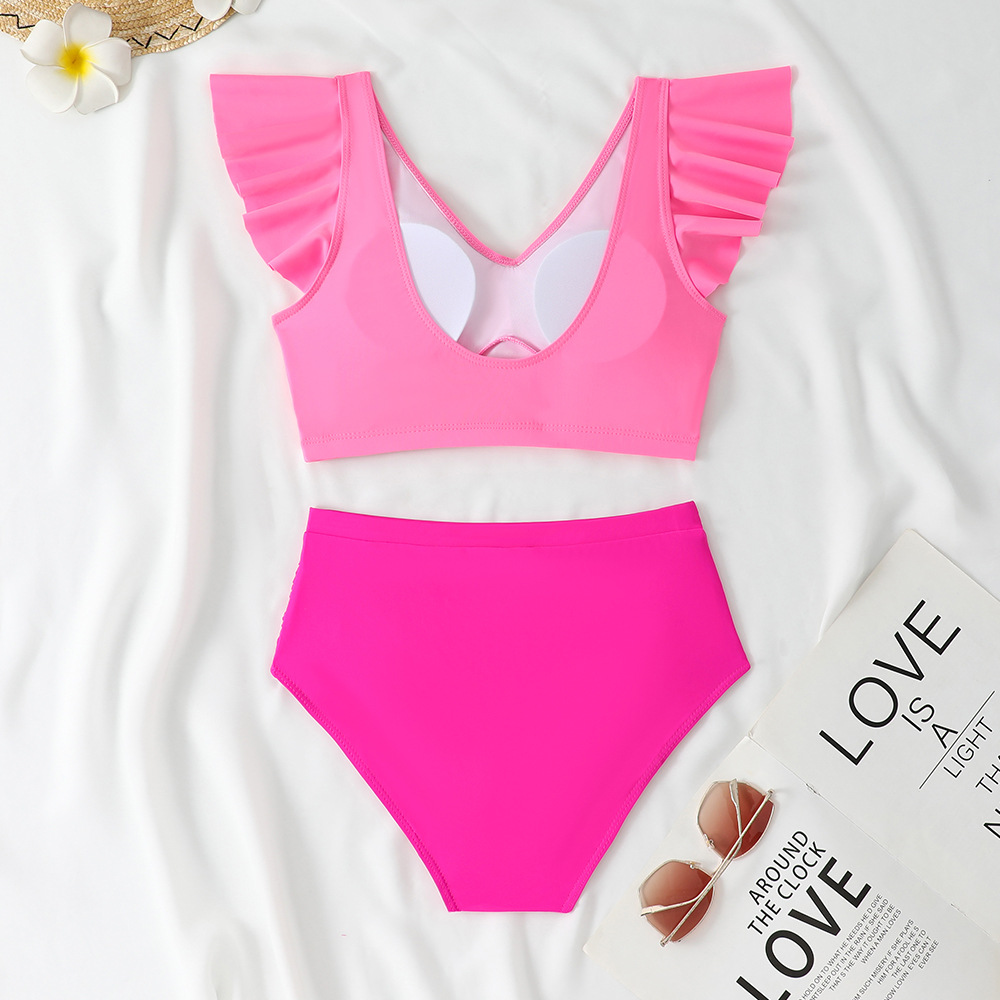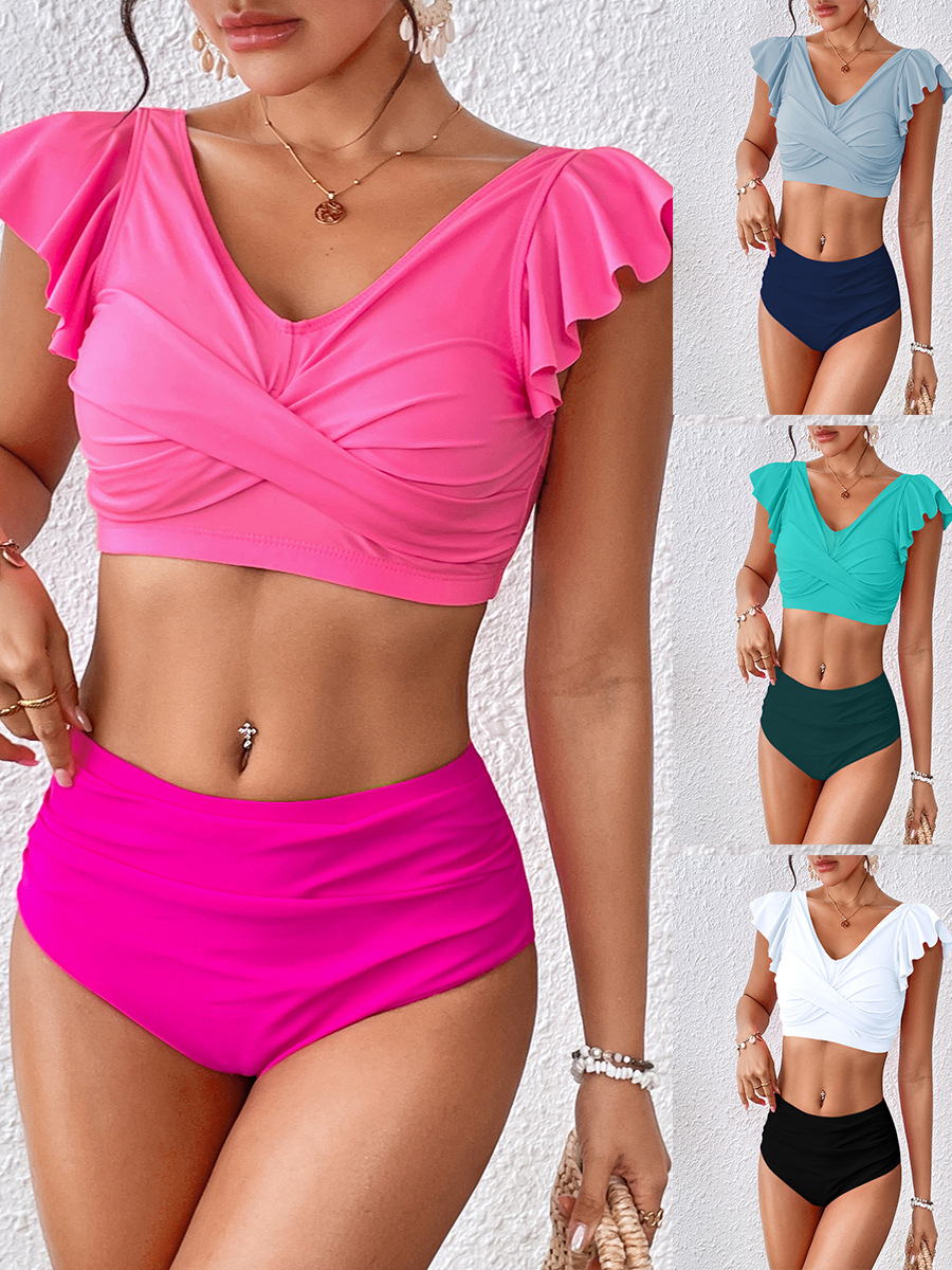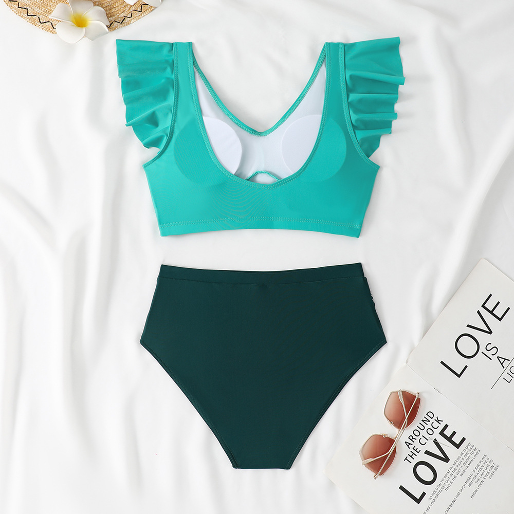 ชุดว่ายน้ำ 2 ชิ้น บิกินี่สีพื้นทูโทนเข้าชุด เสื้อคอวีแต่งระบาย กางเกงเอวสูง