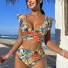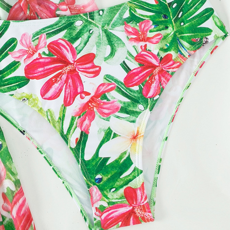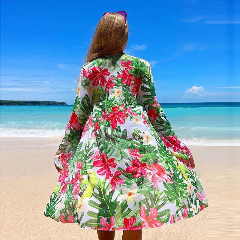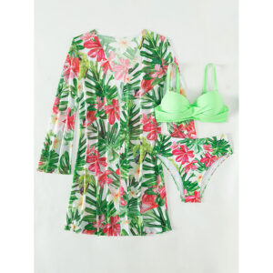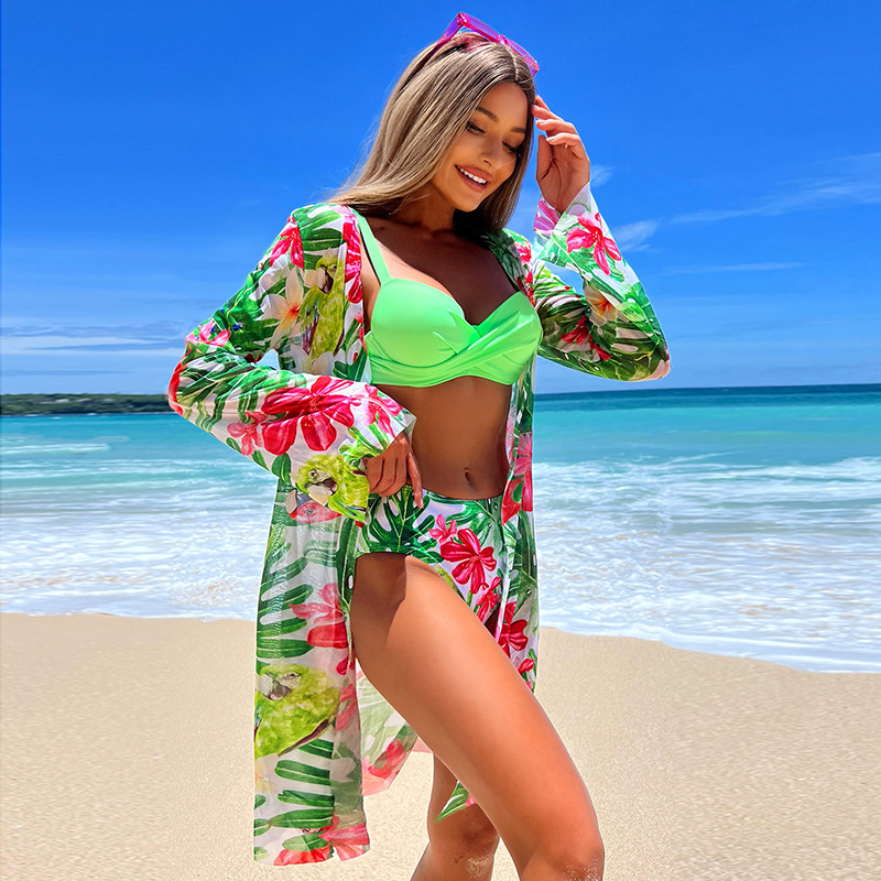 ชุดว่ายน้ำบิกินี่ พร้อมเสื้อคลุมชายหาดพิมพ์ลาย กางเกงเอวสูง เสื้อมีฟองน้ำ เนื้อผ้าโพลีเอสเตอร์ผสมไนลอน