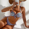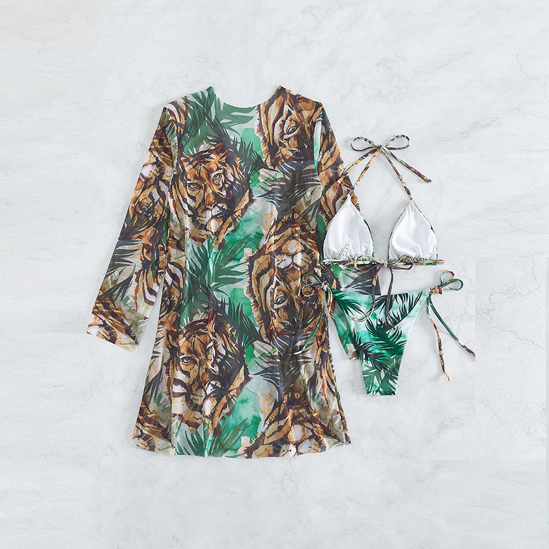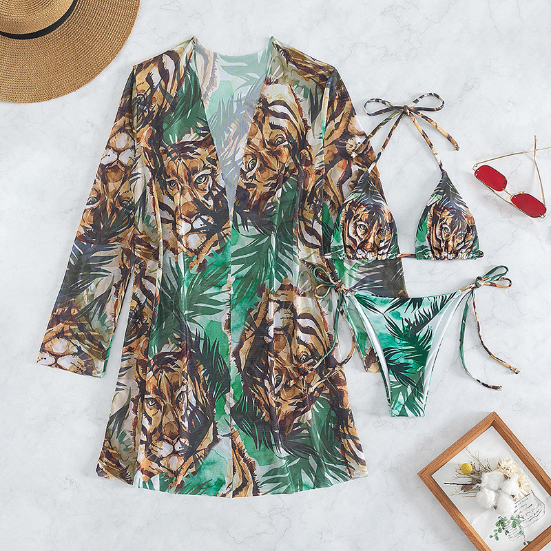 ชุดว่ายน้ำบิกินี่ 2 ชิ้น เซ็กซี่สายคล้องคอ พร้อมเสื้อคลุมพิมพ์ลายเสือ
